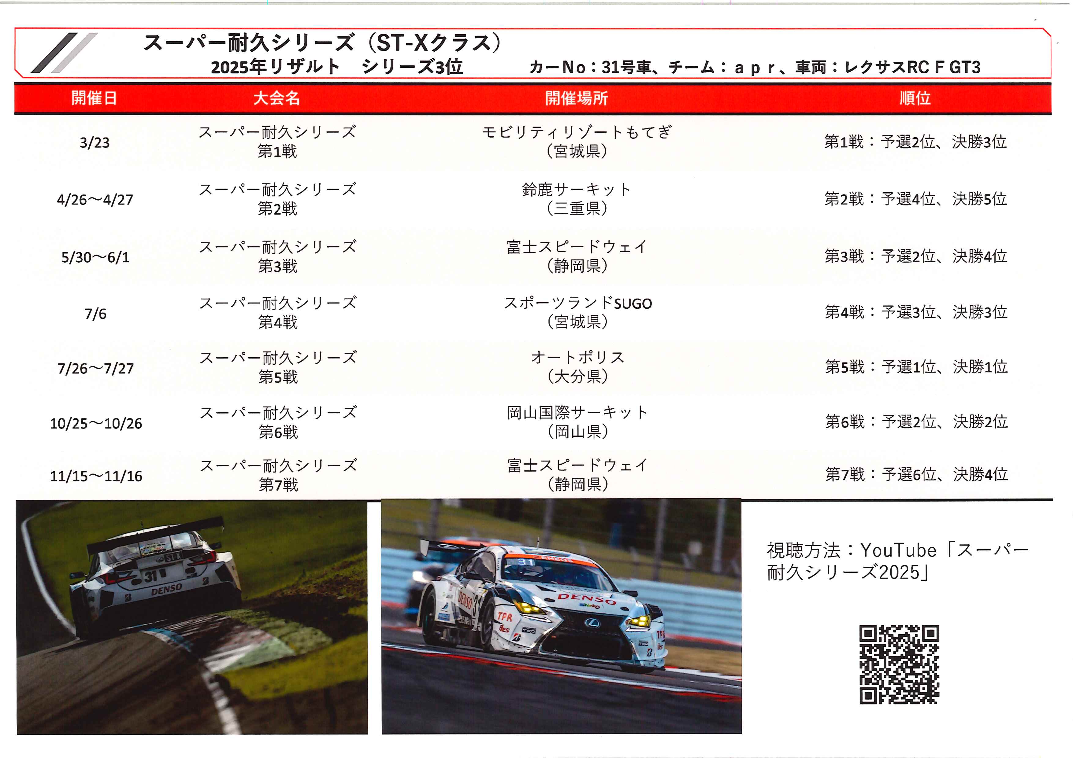 そのほかにも様々なレースにに参戦しております。(スーパー耐久シリーズ/GR86・BRZ Cup/インタープロトシリーズ)